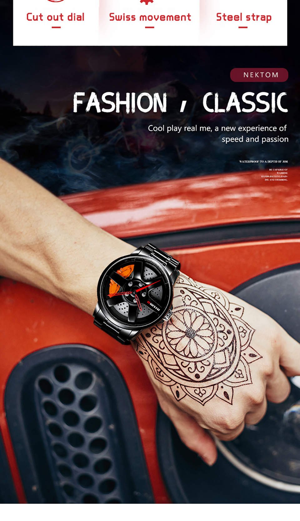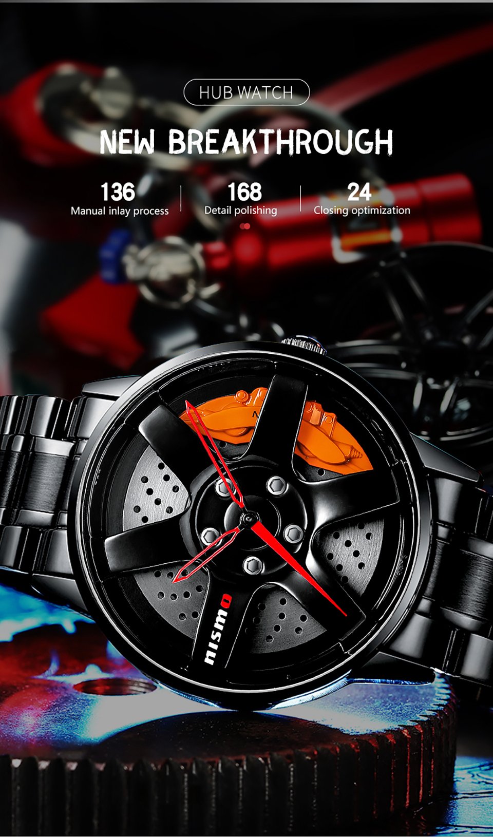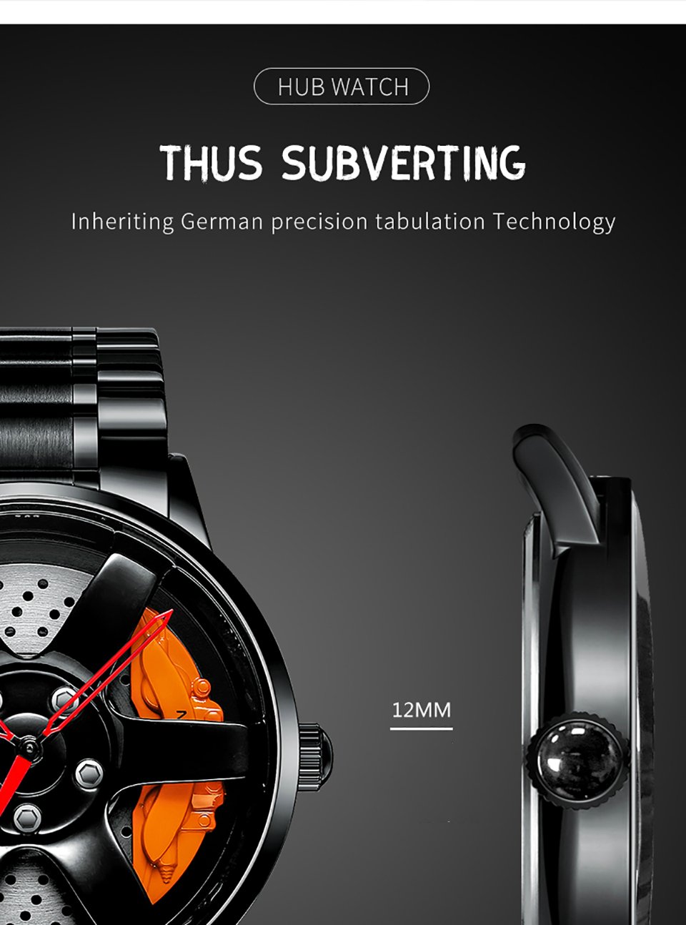 - Automotive-Inspired Dial: 3D hollow-out wheel rim design with drilled brake disc detailing and vibrant orange caliper accents.